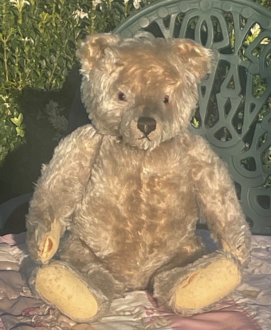 Christopher is an adorable large size old Steiff bear from the 1950’s. He is a big chunky boy Steiff with a handsome face and is quite the character. He stands at 16″ (41cm) has glass eyes, mohair fur. In original condition and really good overall for his age. Some wear to his mohair, mostly around his muzzle. His paw pads are original with some age marks and wear to his left hand felt. His growler no longer works, no button or tags these were often removed for safety before giving to children. He is a wonderful old Steiff bear. Email for his photo file £220 * ON OFFER AT £200 valid until 17.12.25