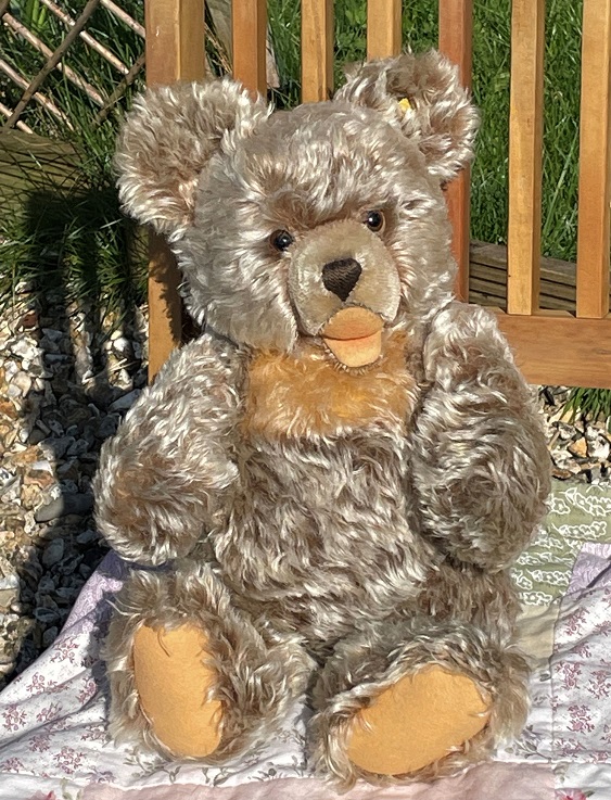 Christopher is an adorable large size old Steiff bear from the 1950’s. He is a big chunky boy Steiff with a handsome face and is quite the character. He stands at 16″ (41cm) has glass eyes, mohair fur. In original condition and really good overall for his age. Some wear to his mohair, mostly around his muzzle. His paw pads are original with some age marks and wear to his left hand felt. His growler no longer works, no button or tags these were often removed for safety before giving to children. He is a wonderful old Steiff bear. Email for his photo file £220 * ON OFFER AT £200 valid until 17.12.25