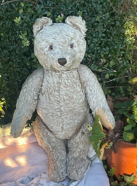 Christopher is an adorable large size old Steiff bear from the 1950’s. He is a big chunky boy Steiff with a handsome face and is quite the character. He stands at 16″ (41cm) has glass eyes, mohair fur. In original condition and really good overall for his age. Some wear to his mohair, mostly around his muzzle. His paw pads are original with some age marks and wear to his left hand felt. His growler no longer works, no button or tags these were often removed for safety before giving to children. He is a wonderful old Steiff bear. Email for his photo file £200 * ON OFFER AT £175 until 6.1.26