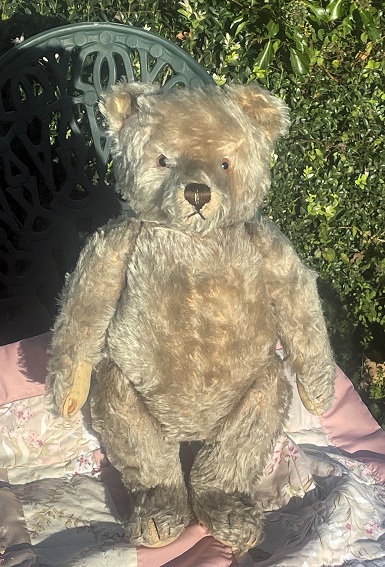 Sammy is an older Steiff bear with an early body shape from the 1950’s. He is fully jointed with glass eyes, mohair fur. His height standing is 13″ (33cm) no button, his tummy squeaker no longer works. He has a slim body shape, long limbs and a long muzzle. His felt paw pads are very good, his mohair is good overall with some wear on his forehead. Email for his photo file. NOW £135