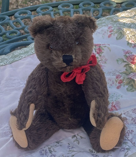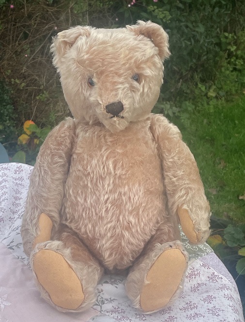 Willow is a very pretty old 1950s Steiff bear with button in her ear (raised script, thin letters) She is an impressive bear with a height of 16″ (40cm) she has mohair fur, glass eyes, original felt paw pads, growler no longer works. She has the delightful slouchy appearance that the older bears have. She has been very well cared for, is very clean a really enchanting bear.