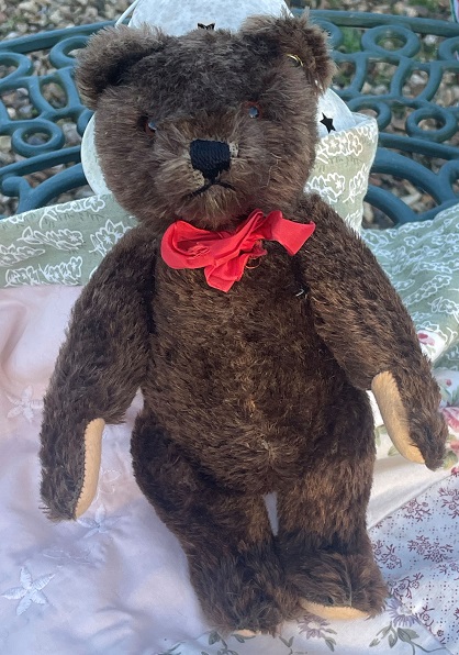 Cocoa is a very rare 1950s Steiff bear with brown mohair fur. In very good condition for his age, very hard to find such a good example as him. He is fully jointed with mohair fur, glass eyes, felt paw pads. His height standing is 9″ (23cm) His fur is its original rich brown colour, no fur loss, just a little wear around his muzzle. His felt paw pads are excellent. He has his Steiff button in ear (raised script, thin letters) tummy squeaker no longer works. He is very clean, and highly recommended. Such a hard Steiff bear to find now in this colour. Email for his photo file £225