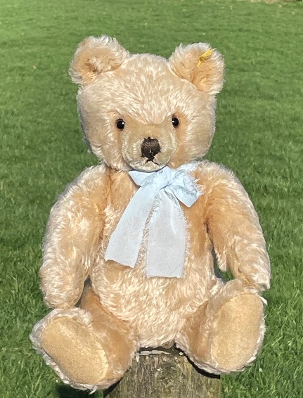 Missy is a very pretty older Steiff ‘mask’ bear from the 1960s-70s. She has blonde mohair, glass eyes, is fully jointed. Height standing 15″ (38cm) Steiff lentil button in ear & stock label. Ean number 0201:36 dates her to being made 1968-1990. She has felt paw pads (some age wear marks to them) a working tilt growler. She has some kapok settlement in her upper arms from being held. Otherwise she is in really nice good clean condition for her age.