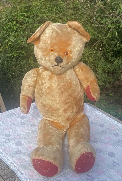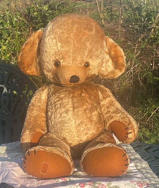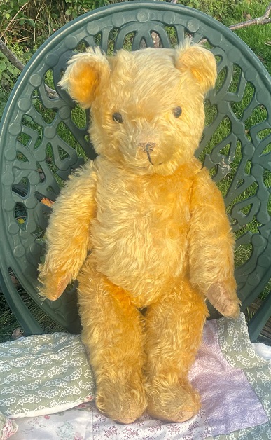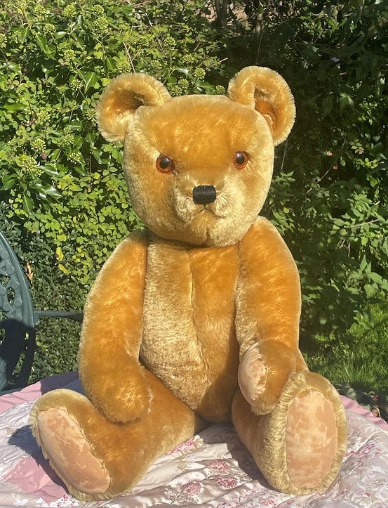Maximus is a very impressive large old British UK bear with immense charm. He is 27″ (70cm) in length, fully jointed, with glass eyes and golden mohair fur. His tilt growler sounds more like he is sneezing now. Being such a large bear he is best suited to sitting. He is in wonderful condition for his age and very clean. One small area of the seam has partly come undone on an arm seam and by a hand paw. His joints are more swingy than when new but firmly fixed. He is a very handsome bear, no maker label but certainly by a good maker of the time. Email for his photo file £145