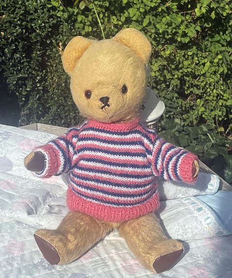 Jimmy is a great character with some age to him, c.1950s-60s. A British/UK bear, fully jointed with glass eyes (the right one is at a slight angle but firmly fixed) faux leather paw pads, mohair fur (now quite worn with age) squeaker no longer works, no maker’s tag. Height standing 14″ (36cm) He comes wearing his snug warm jumper. Email for his photo file £45