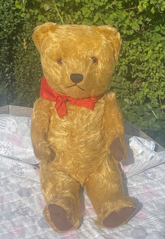 Chrissie is a wonderful example of an older British childhood bear from the c.1960s. In really good original condition and very clean. Has mohair fur, glass eyes, rexine paw pads, a stitched nose and mouth. Fully jointed, her standing height is 16″ (40cm) tummy squeaker no longer works, no maker’s tags. Certainly by a good maker of the time, possibly Chiltern or Deans. Email for her photo file. £75