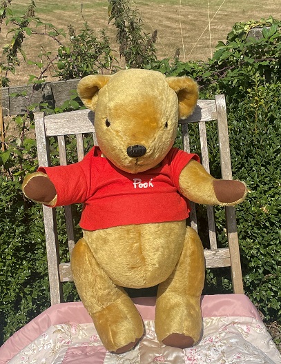 A very hard to find original old Merrythought ‘Pooh’ bear in the large size of 25” (65cm) He came to us from the original owner who have taken great care of him since new. From the 1960’s-1970’s. He is in superb condition for his age and size, and very clean. He is fully jointed with mohair fur, material paw pads and has his Merrythought label. He has his original red felt top with POOH on it. For his age and size he has minor signs of wear enough to show he really is a very old bear now, and not a modern reproduction. His red felt top shows signs of age and has a small area of wear under his left arm. He would have been an expensive bear when purchased, and few this size and now found in such lovely condition. A very sought-after, bear of the time and still very popular today. Email for his photo file. £345