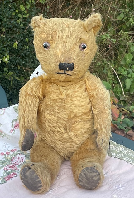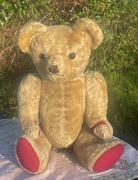 Chrissie is a wonderful example of an older British childhood bear from the c.1960s. In really good original condition and very clean. Has mohair fur, glass eyes, rexine paw pads, a stitched nose and mouth. Fully jointed, her standing height is 16″ (40cm) tummy squeaker no longer works, no maker’s tags. Certainly by a good maker of the time, possibly Chiltern or Deans. Email for her photo file. £70