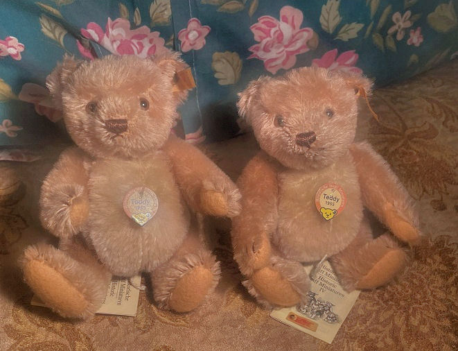 Tess and Jess are the sweetest pair of vintage Steiff Original Teddybears from the 1990s. They still have their button in ear, stock label, chest tag, and paper swing tags attached. They are fully jointed, with 2 colour mohair fur, realistic plastic eyes, felt paw pads, and a small tail. Their height standing is 7″ (17cm). They are from the Steiff Historic Miniatures series. They are very good for their ages, with some minor thinning of fur in places (see photos). They have always been together, so we would prefer they go together, but have priced them for one or for the pair.