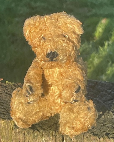 Little Pal is a very old small pocket sized bear from Germany. c.1950s. He has metal rod jointed limbs and a fixed head. Glass eyes, cotton plush fur popular after WW2 when mohair was in short supply He has a stitched nose, mouth and claws. Height standing is 5″ (12cm) He is small enough to be a companion/mascot bear. For his age he has survived well, with some discolouration to his fur. Few of these small bears are seen now. ADOPTED