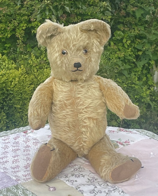 Tristan is an adorable antique British teddy bear from the c.1930s. He is a good size, standing at almost 20″ (50cm) to the top of his ears. He has thick blonde mohair, glass eyes, a shaved muzzle, with a stitched nose, mouth, and 3 claws to each foot. (1 has come undone at one end) His tummy squeaker still works well, the paw pads are mostly good, with some wear and a small area has frayed on a hand paw. Overall he is in really good condition for his age and by a quality bear maker of the time. It is really hard to find such an early bear in such good condition. Email for his photo file. £195