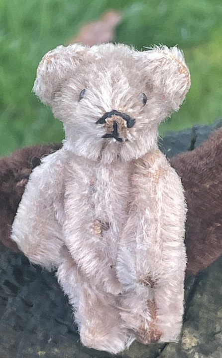 TuTu is a very old miniature Schuco ‘mascot/pocket’ bear from the 1940s-50s. He has metal eyes and bod with mohair fur. Fully jointed, standing height is 2.5″ (7cm) For his age, he has survived well with some wear to his fur see photos. These delightful tiny bears were often given as lucky mascots and travelled with people in pockets or bags. Email for his photo file. £70