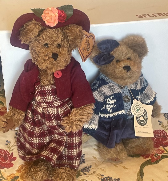 Lovely pair of vintage jointed plush bears, by Boyds/Heartfelt. wearing well-made outfits. Heights 13″ & 10″. In very good condition with tags. ADOPTED