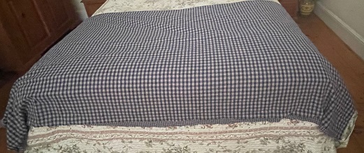 Our photo shows it on a king-size bed. It is ideal for use as a teddy bear picnic sheet or to be used in other ways to suit the bears. Freshly laundered, it still smells ‘old’ but not of any smoke.