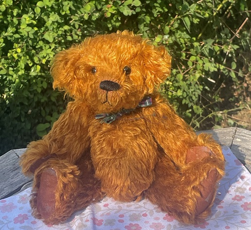 Copper is a lovely vintage British bear with cinnamon colour mohair fur. He is fully jointed, with glass eyes, his suede paw pads have some wear but no holes in them. His height standing is 9.5″ (24cm) part pellet filled with label on back seam. (The Teddy Bear Shop) Good for age c.1990s. Photos taken in the sunlight make his fur look lighter indoors his fur is a darker copper colour. Email for his photo file. £35