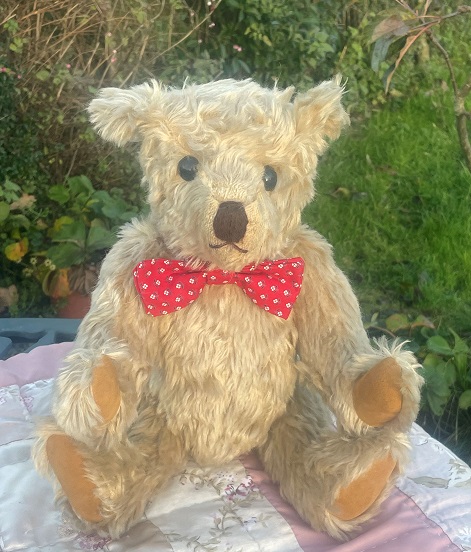 George is a very old looking vintage artist bear by ‘Berenice Bears’ He has thick blonde mohair fur, suede paw pads, realistic plastic eyes. His height standing is 15″ (38cm) makers label. He comes with his very smart bow tie. He is in very good condition. Email for his photo file £40
