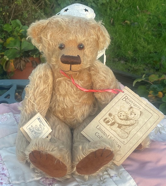 Wilbur is a lovely vintage artist bear by ‘Bramsgore Bears’ from 2001. He is a limited edition of only 30. He comes with all his tags, labels. Wilbur has mohair fur, his height standing is 13″ (33cm) suede paw pads, a quality weighted bear. With his happy cheeky face he is a lovely bear by this well known maker. In very good condition. Email for his photo file £40